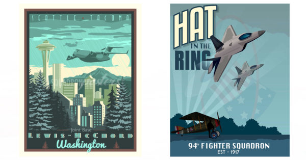 Our art represents not just aircraft, armored cavalry, or ships, it represents adventure and travel. This means we create posters featuring the Space Needle, New Orleans, the Golden Gate Bridge, Mt Rushmore and the National Mall. Of course, McChord AFB isn’t in Seattle but if you’re stationed there your adventure surely involves the Space Needle! This is what makes Squadron Posters different–it’s about remembering where you’ve lived and what you’ve seen with a vintage themed travel poster.