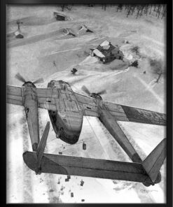 This painting portrays Civil Air Patrol members of the Nebraska wing kicking hay bales out of a C-82 Flying Boxcar to starving cattle at a snowbound ranch below. The Great Plains Blizzard of 1949 left a snow-covered swath from Arizona to Wyoming leaving 40-foot-tall drifts that lasted for months.