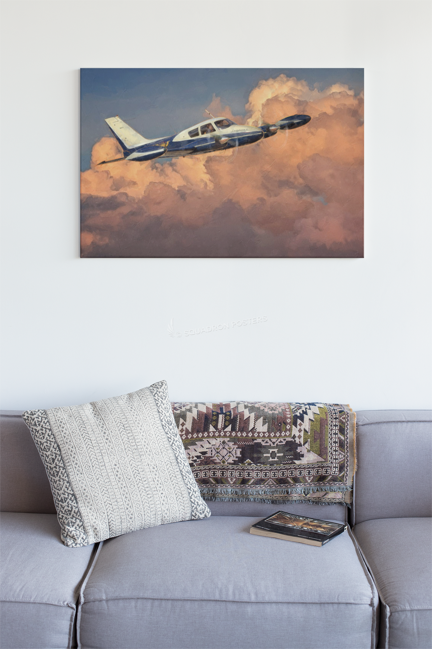 “Out of the clear blue of the western sky comes…SKY KING!” Many, many future aviators were bitten by the bug while watching the 1950s TV serial “Sky King.” As TV’s Flying Cowboy, Sky and his niece, Penny, provided wholesome adventure and the first aircraft to appear in a starring role—the Songbird! Portraying one of the three different aircraft used for the show, Ron Finger’s portrait of “Songbird III,” a Cessna 310D, was recently commissioned by FLYING Magazine for their “Ultimate Issue” seen HERE.