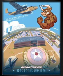 Goodfellow Air Force Base is a non-flying United States Air Force base located in San Angelo, Texas, United States. As part of Air Education and Training Command, Goodfellow’s main mission is cryptologic and intelligence training for the Air Force, Space Force, Army, Coast Guard, Navy, and Marine Corps. Military firefighters are also trained here as part of the 312th Training Squadron. It is the home of the 17th Training Wing. The base is named for World War I aviator First Lieutenant John J. Goodfellow Jr. – Check out this stunning Goodfellow AFB Texas 17th CPTS Longhorns art by – Squadron Posters!