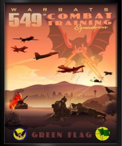 The Green Flag mission begins long before tactical operations occur on the battlefield. 549th CTS and 12th CTS planners begin designing the exercise approximately six months before forces arrive to begin maneuvers. Air Combat Command determines which, and how many flying units will participate and the 549th CTS works with those units to build an integrated plan to maximize joint and individual unit training. Check out this stunning Nellis AFB 549th CTS Green Flag art by Squadron Posters!