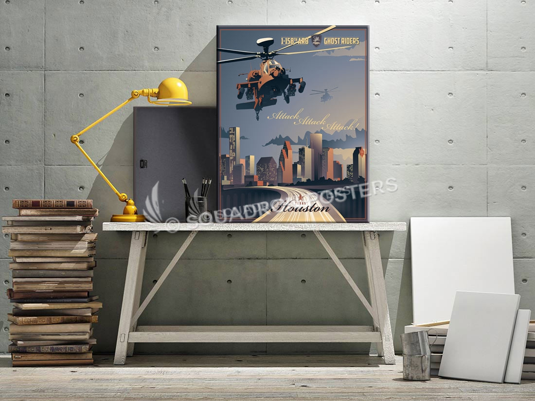 This vintage style military aviation travel poster “1-158th Aviation Regiment” artwork is dedicated to all those who serve with the 1-158th Aviation Regiment and the AH-64 ApacheThe Boeing AH-64 Apache is a four-blade, twin-engine attack helicopter with a tail wheel-type landing gear arrangement, and a tandem cockpit for a two-man crew. It features a nose-mounted sensor suite for target acquisition and night vision systems.