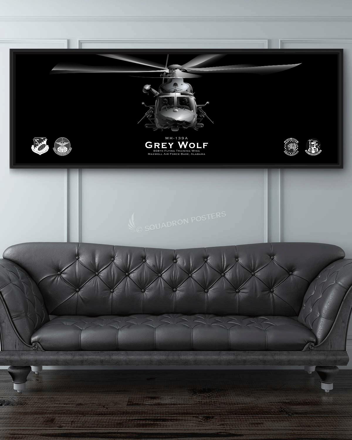 The MH-139A Grey Wolf is to be used for security patrols, search and rescue missions, and personnel and cargo transport. The Air Force’s first intention was to purchase 84 helicopters for security and transportation across extensive ICBM fields, and senior leader and executive airlift in the Air Defense Identification Zone (ADIZ), also known as the National Capital Region. It is also to be used in aircrew survival training. Check out this stunning 908th FTW MH-139A Jet Black Lithograph Art by – Squadron Posters! Collect all your travels and tell your story!