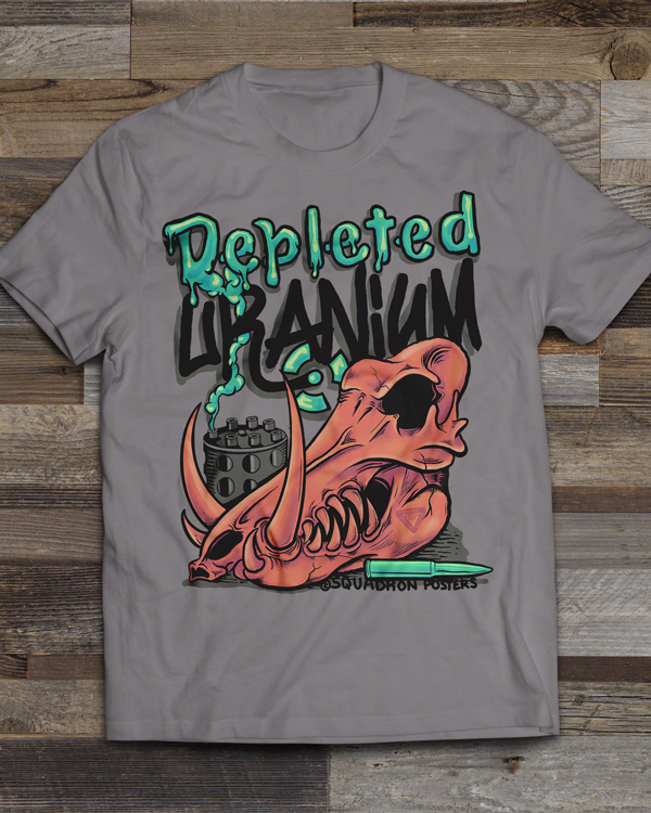 The A-10 Warthog fires depleted uranium rounds out of the GAU-8/A Avenger gatling gun to aid in penetrating thick tank armor. This T-Shirt features a Warhtog Skull, a Uranium round, and the gun barrel shroud with the words “Depleted Uranium”.