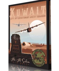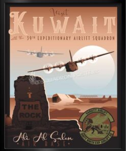 Ali Al Salem Air Base was the last to be overrun during the Iraqi invasion of Kuwait. By August 1990, it was the only Kuwaiti air base not occupied by Iraq. A small number of Kuwaiti regulars, staff officers, and the base Commander, General Saber Suwaidan stayed to fight and organize resupply missions from Saudi Arabia. By the end of the day, Ali Al Salem had been overrun. Upon discovery by the Iraqi military, the Kuwaiti General was hanged from the base flagpole by Iraqi troops. New flagpoles have since been installed, however as of December 2012, the original pole still stands. The remaining Kuwaiti military personnel were lined up outside the old Kuwaiti officers’ club and shot. While no longer used, the building and bullet holes remain. Check out this stunning Ali Al Salem AB 39th EAS Art by Squadron Posters!