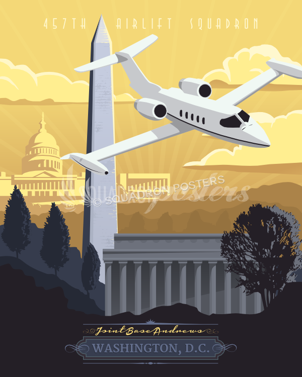 This poster is for all the hard working men and women at Joint Base Andrews. The 457th Airlift Squadron is part of the 375th Airlift Wing at Andrews Air Force Base, Maryland and it operates C-21 aircraft providing executive airlift. The mission of the 457th AS is to transport military and civilian leaders to key destinations and events to work on national security issues.