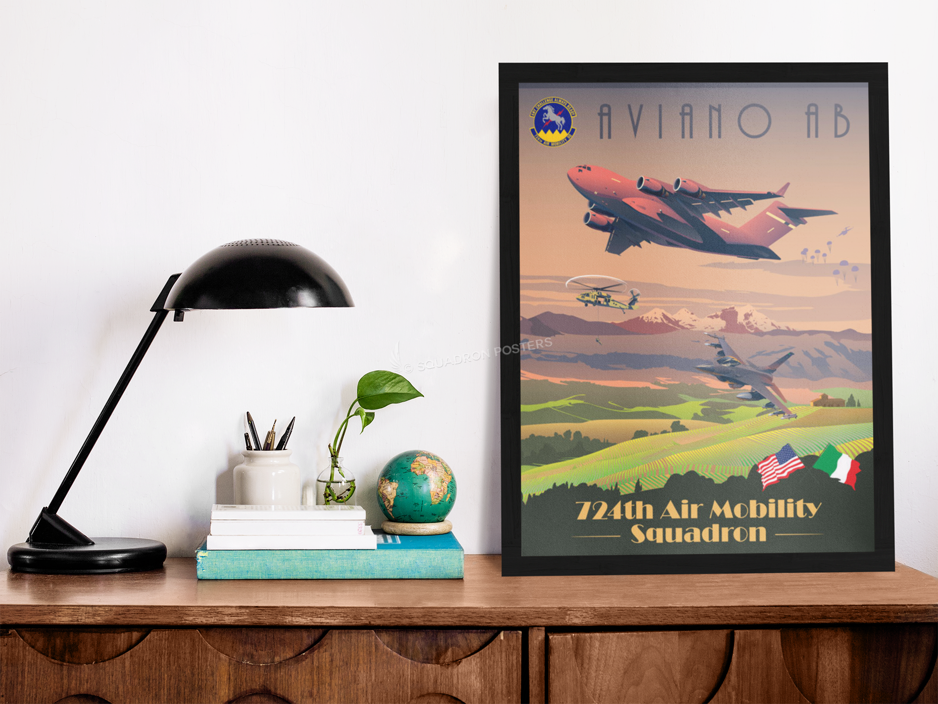 Aviano Air Base, located in northeastern Italy, is a pivotal hub for U.S. and NATO air operations in Europe. Home to the 31st Fighter Wing, Aviano AB plays a crucial role in maintaining regional stability and projecting power across the Mediterranean and beyond. Its strategic location allows for rapid deployment and support of missions throughout Europe, the Middle East, and Africa. The base supports a diverse array of aircraft and missions, from fighter operations to air mobility. With a rich history and a commitment to excellence, Aviano AB continues to be a vital link in the chain of global security and defense. Check out this stunning Aviano AB 724th AMS Art by – Squadron Posters! Collect all your military travels and tell your story!