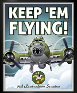 This artwork captures the historic spirit of the air crews who bravely took to the skies over Europe and the Pacific, carrying with them the hopes of a nation. With the rallying cry “Keep ’Em Flying,” this print is a timeless tribute to the legacy of the bomber that helped turn the tide of war.