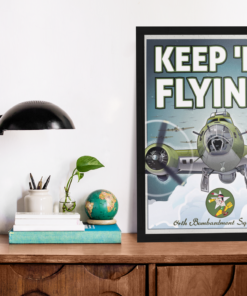 This artwork captures the historic spirit of the air crews who bravely took to the skies over Europe and the Pacific, carrying with them the hopes of a nation. With the rallying cry “Keep ’Em Flying,” this print is a timeless tribute to the legacy of the bomber that helped turn the tide of war.