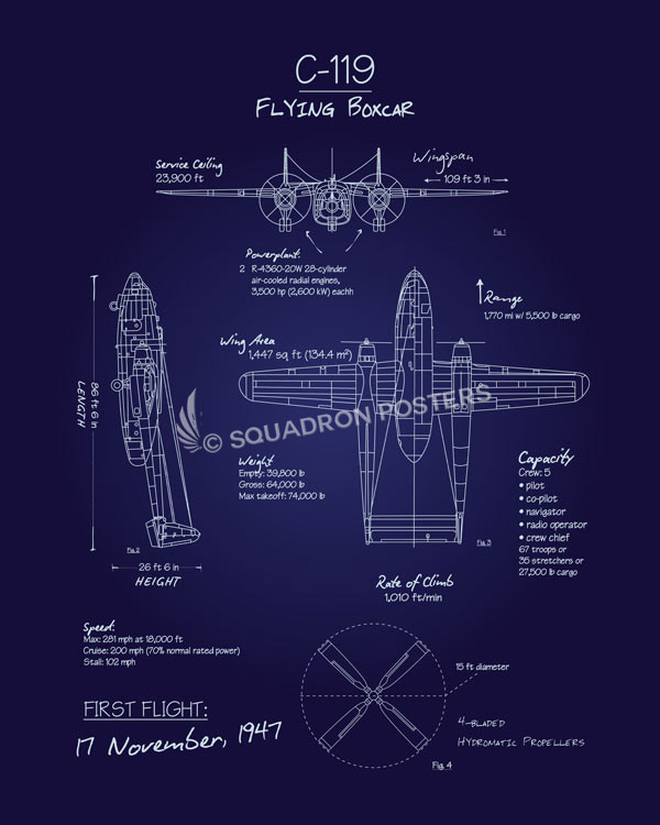 “C-119 Flying Boxcar Blueprint” vintage style military aviation travel poster art by – Squadron Posters!