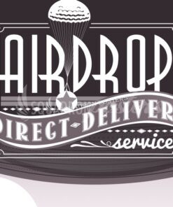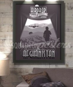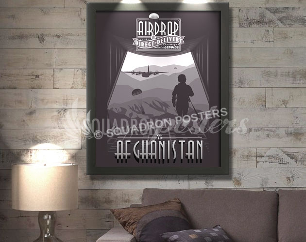 This C-130 Airdrop Afghanistan print features a whiskey label that reads ‘Airdrop Direct-Delivery Service to Afghanistan’. A loadmaster watches as his drop drifts towards the Drop Zone (DZ) as the #2 C-130 maintains the formation.