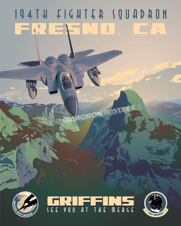The 194th Fighter Squadron (194 FS) is a unit of the California Air National Guard’s 144th Fighter Wing (144 FW) at Fresno Air National Guard Base, California, near Yosemite National Park. The 194th is equipped with the F-15C Eagle and like its parent wing, is operationally-gained within the active U.S. Air Force by the Air Combat Command (ACC). Nickname: “Griffins!”
