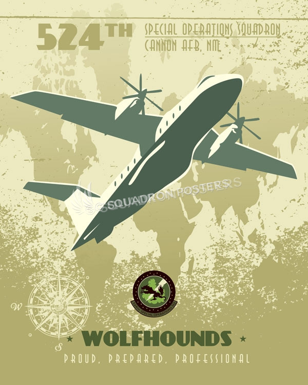 Cannon AFB 524th SOS C-146A Wolfhound poster art. The 524th Special Operations Squadron (524th SOS), located at Cannon Air Force Base, N.M., is one of seven flying squadrons within the 27th Special Operations Wing. The squadron flies C-146A ‘Wolfhound‘ specialized airlift aircraft. The unit utilizes these aircraft to accomplish global special operations taskings as an Air Force component member of USSOCOM. Crews plan, prepare and execute non-standard aviation (NSAv) missions in support of joint-special operations forces while directly supporting theater special operations commanders by conduction of night vision goggle (NVG) infiltration, exfiltration, resupply and other combat taskings on unimproved runways. The C-146A is a twin-engine, high-wing aircraft equipped with a configurable cabin capable of various passenger and cargo combinations, as well as casualty evacuation (CASEVAC) missions. The aircraft can carry a maximum of 27 passengers or 6,000 pounds of cargo, or up to four litter patients.