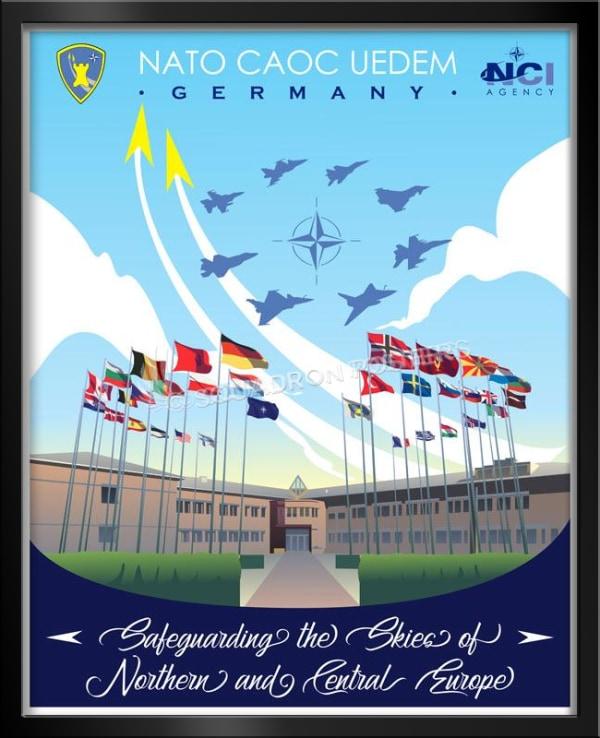 NATO CAOC Uedem is located near Uedem, Germany . It is responsible for all Air Policing matters in European NATO Airspace north of the Alps. This artwork highlights the nations that work together in defense.