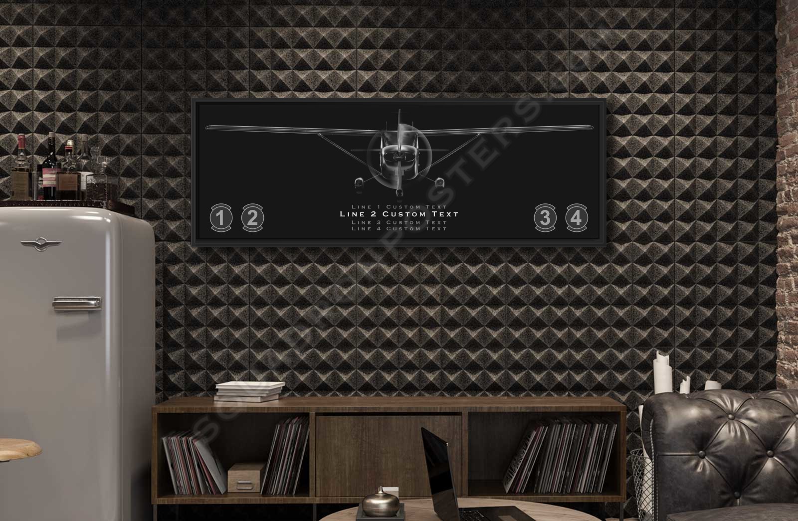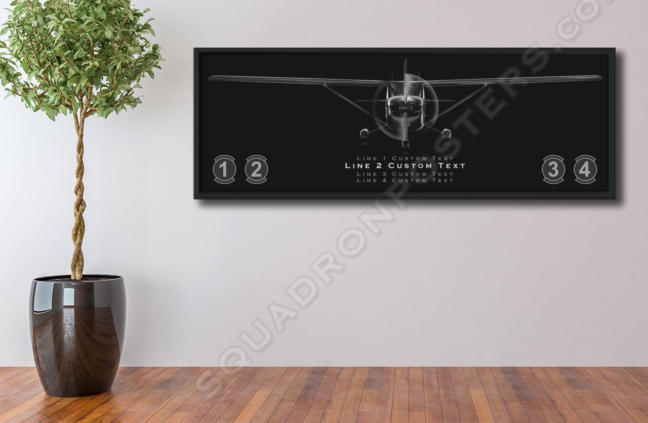 This Cessna 172 Skyhawk Jet Black Artwork is based on the famous American four-seat, single-engine, high wing, fixed-wing aircraft made by the Cessna Aircraft Company.  First flown in 1955, more 172s have been built than any other aircraft. For many pilots, the Cessna 172 Skyhawk is the first airplane they learn to fly on. Honor your flight experience in the Skyhawk with the giant 60×20 Jet Black Super Wide artwork, available in other sizes. See below for a size chart.