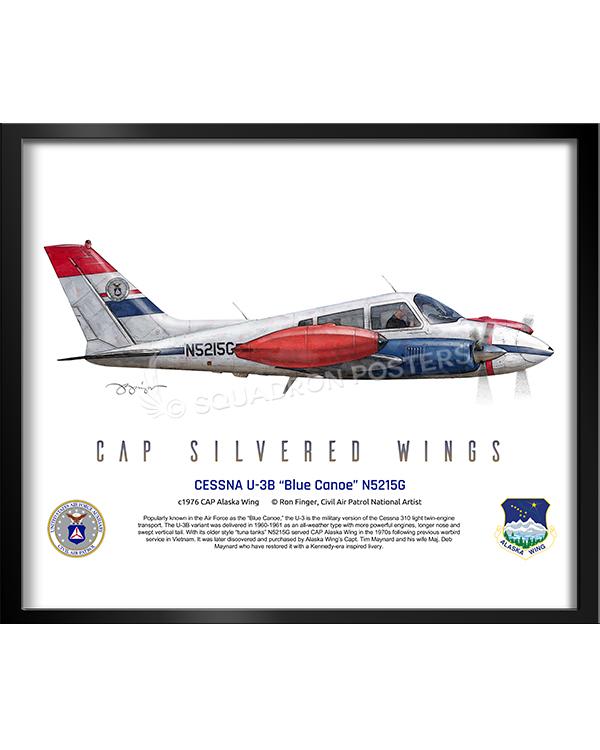 Popularly known in the U.S. Air Force as the “Blue Canoe,” the U-3 is the military version of the Cessna 310 light twin-engine transport. The U-3B variant was delivered in 1960-1961 as an all-weather type with more powerful engines, a longer nose, and a swept vertical tail. With its older-style “tuna tanks,” N5215G served Civil Air Patrol’s Alaska Wing in the 1970s following service in Vietnam. It was later discovered and purchased by the Alaska Wing’s Capt. Tim Maynard and his wife, Maj. Deb Maynard, who have restored and repainted it with a Kennedy era-inspired livery.