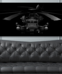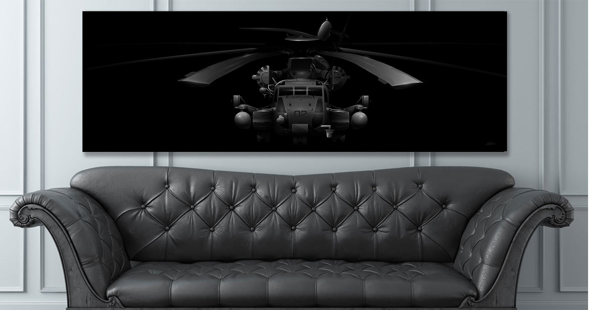 The Jet Black Super Wide canvas art showcases the powerful CH-53E Super Stallion, the largest and most impressive helicopter in the US military. This striking piece of art showcases the intricate details of the Sikorsky S-80, developed from the CH-53 Sea Stallion with the addition of a third engine, a seventh blade to the main rotor, and a unique 20-degree cant to the tail rotor. Honor the impressive engineering and design of this magnificent machine built by Sikorsky Aircraft for the U.S. Marines.