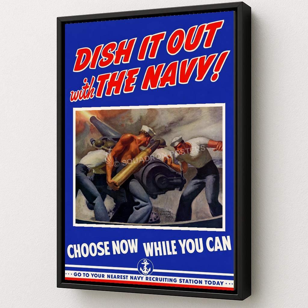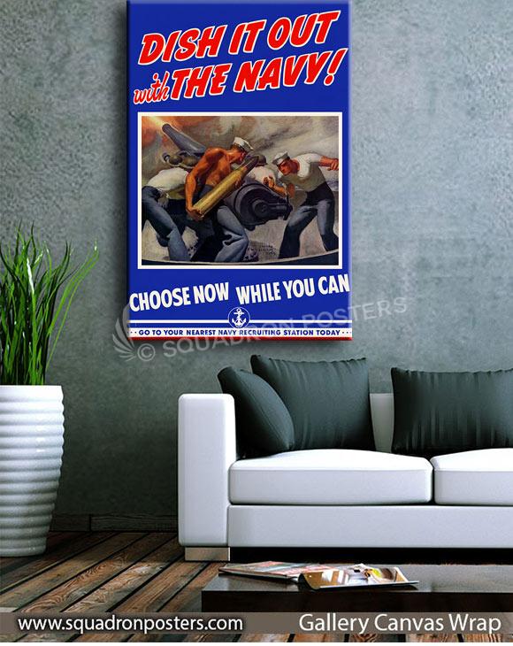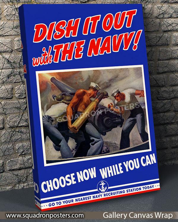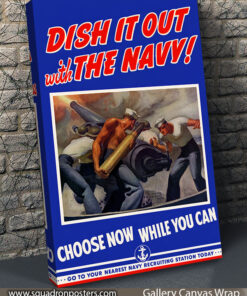 Inspired by classic U.S. Navy recruitment and wartime posters, this historic artwork captures the confidence and fighting spirit of American sailors. The bold message “Dish It Out” reflects the Navy’s readiness to meet any challenge at sea with strength and determination. Rendered in a vintage poster style, this piece honors the sailors who served on the front lines of naval power during times of global conflict. A strong addition for collectors, veterans, and naval history enthusiasts, this artwork celebrates the resolve and capability of the United States Navy.