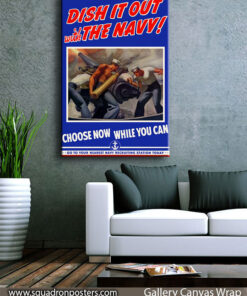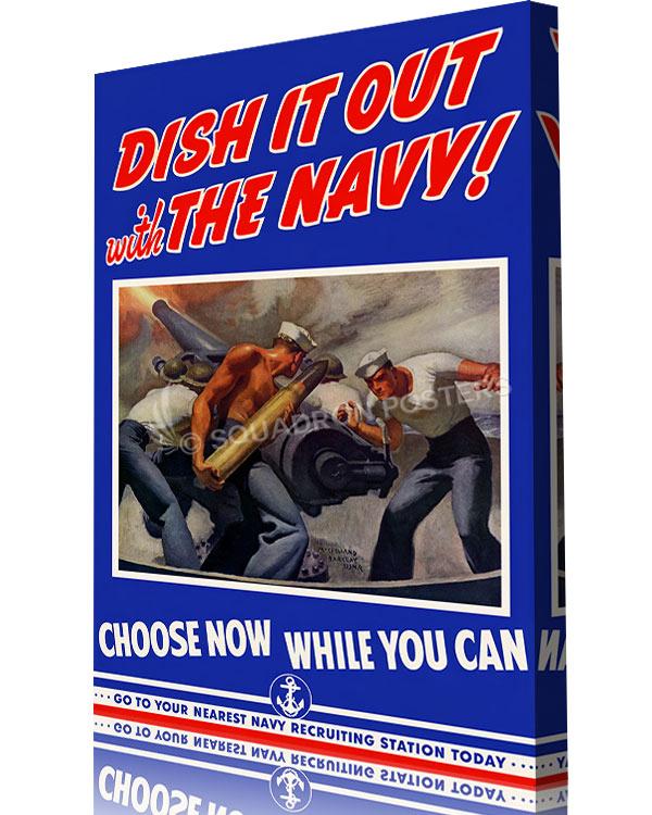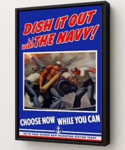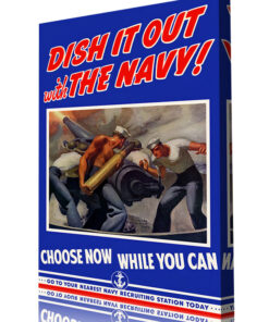 Inspired by classic U.S. Navy recruitment and wartime posters, this historic artwork captures the confidence and fighting spirit of American sailors. The bold message “Dish It Out” reflects the Navy’s readiness to meet any challenge at sea with strength and determination. Rendered in a vintage poster style, this piece honors the sailors who served on the front lines of naval power during times of global conflict. A strong addition for collectors, veterans, and naval history enthusiasts, this artwork celebrates the resolve and capability of the United States Navy.