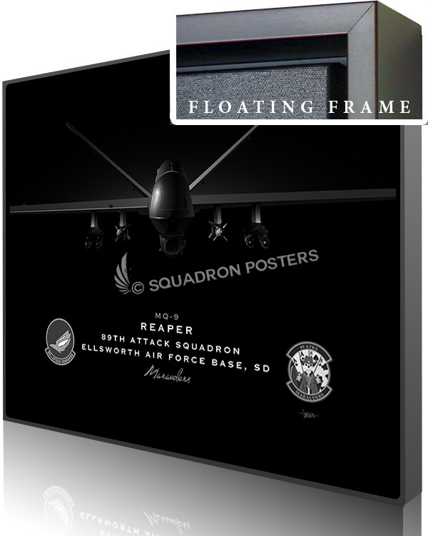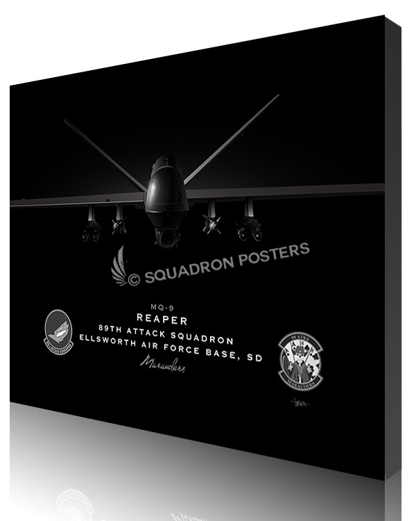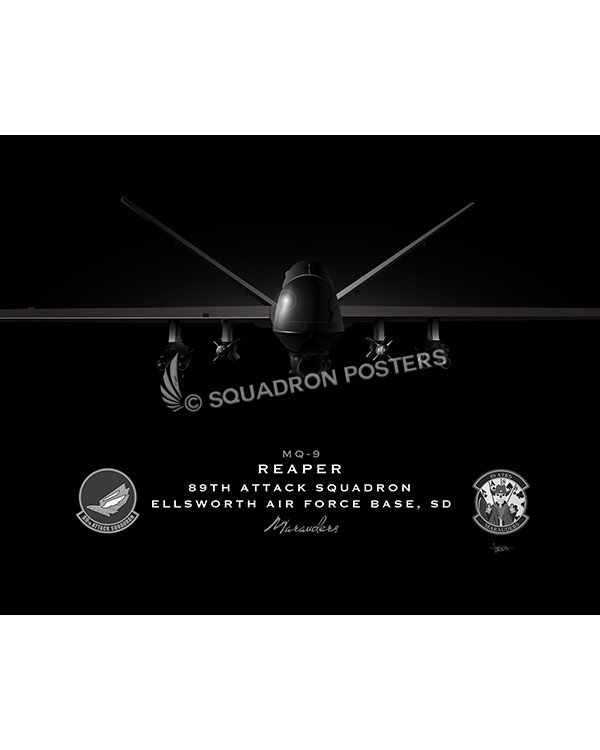 The General Atomics MQ-9 “Reaper” (sometimes called Predator B) is an unmanned aerial vehicle capable of remotely controlled or autonomous flight operations, developed by General Atomics Aeronautical Systems primarily for the United States Air Force. The MQ-9 and other UAVs are referred to as Remotely Piloted Vehicles/Aircraft by the USAF to indicate ground control by humans. The MQ-9 is a larger, heavier, more capable aircraft than the earlier General Atomics MQ-1 Predator and can be controlled by the same ground systems. Check out this stunning Ellsworth AFB 89th ATKS Jet Black Lithograph art by Squadron Posters!