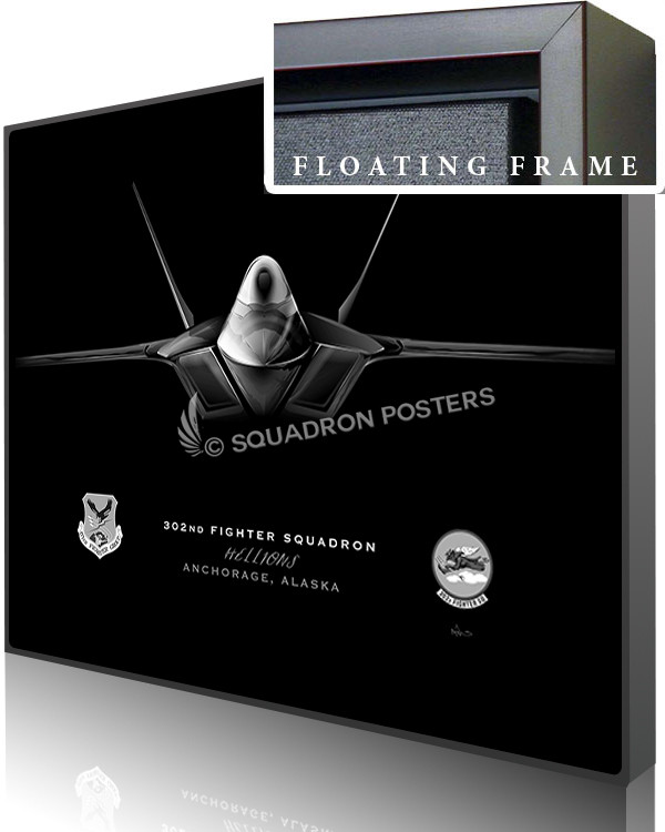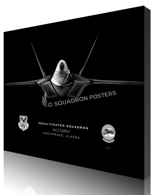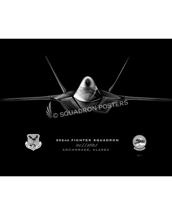 Elmendorf AB F-22 302d FS Jet Black Lithograph art. The 302nd Fighter Squadron (302d FS) is an F-22 Squadron at Joint Base Elmendorf-Richardson (JBER) in Anchorage, AK. The 302nd is a Reserve Squadron with Air Force Reserve Command (AFRC) which is part of the 477th Fighter Group.