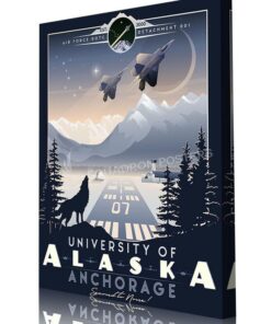 The University of Alaska Anchorage (UAA) is a public university in Anchorage, Alaska. UAA also administers four community campuses spread across Southcentral Alaska: Kenai Peninsula College, Kodiak College, Matanuska–Susitna College, and Prince William Sound College. Between the community campuses and the main Anchorage campus, roughly 15,000 undergraduate, graduate, and professional students are currently enrolled at UAA. It is Alaska’s largest institution of higher learning and the largest university in the University of Alaska System. UAA’s main campus is located approximately four miles (6.4 km) southeast of its downtown area in the University-Medical District, adjacent to the Alaska Native Medical Center, Alaska Pacific University and Providence Alaska Medical Center. UAA is divided into five instructional and research units at the Anchorage campus: the College of Arts and Sciences, College of Business and Public Policy, the Community and Technical College, College of Engineering, and the College of Health. UAA offers master’s degrees and graduate certificates in select programs, and the ability to complete certain PhD programs through cooperating universities through its Graduate Division. Check out this stunning University of Alaska AFROTC Det 001 Elmendorf Field art by – Squadron Posters!