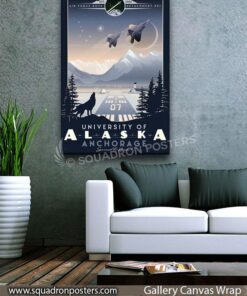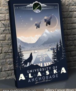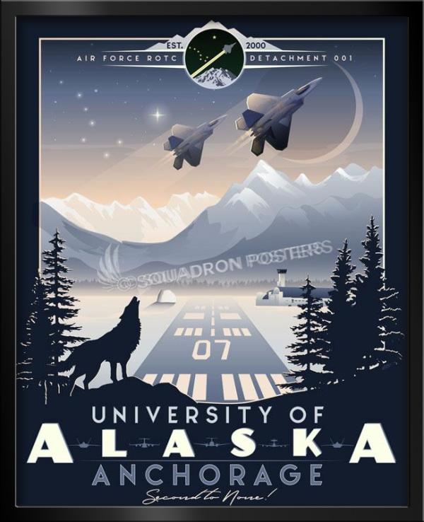 The University of Alaska Anchorage (UAA) is a public university in Anchorage, Alaska. UAA also administers four community campuses spread across Southcentral Alaska: Kenai Peninsula College, Kodiak College, Matanuska–Susitna College, and Prince William Sound College. Between the community campuses and the main Anchorage campus, roughly 15,000 undergraduate, graduate, and professional students are currently enrolled at UAA. It is Alaska’s largest institution of higher learning and the largest university in the University of Alaska System. UAA’s main campus is located approximately four miles (6.4 km) southeast of its downtown area in the University-Medical District, adjacent to the Alaska Native Medical Center, Alaska Pacific University and Providence Alaska Medical Center. UAA is divided into five instructional and research units at the Anchorage campus: the College of Arts and Sciences, College of Business and Public Policy, the Community and Technical College, College of Engineering, and the College of Health. UAA offers master’s degrees and graduate certificates in select programs, and the ability to complete certain PhD programs through cooperating universities through its Graduate Division. Check out this stunning University of Alaska AFROTC Det 001 Elmendorf Field art by – Squadron Posters!