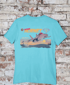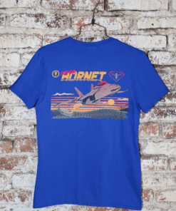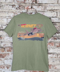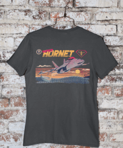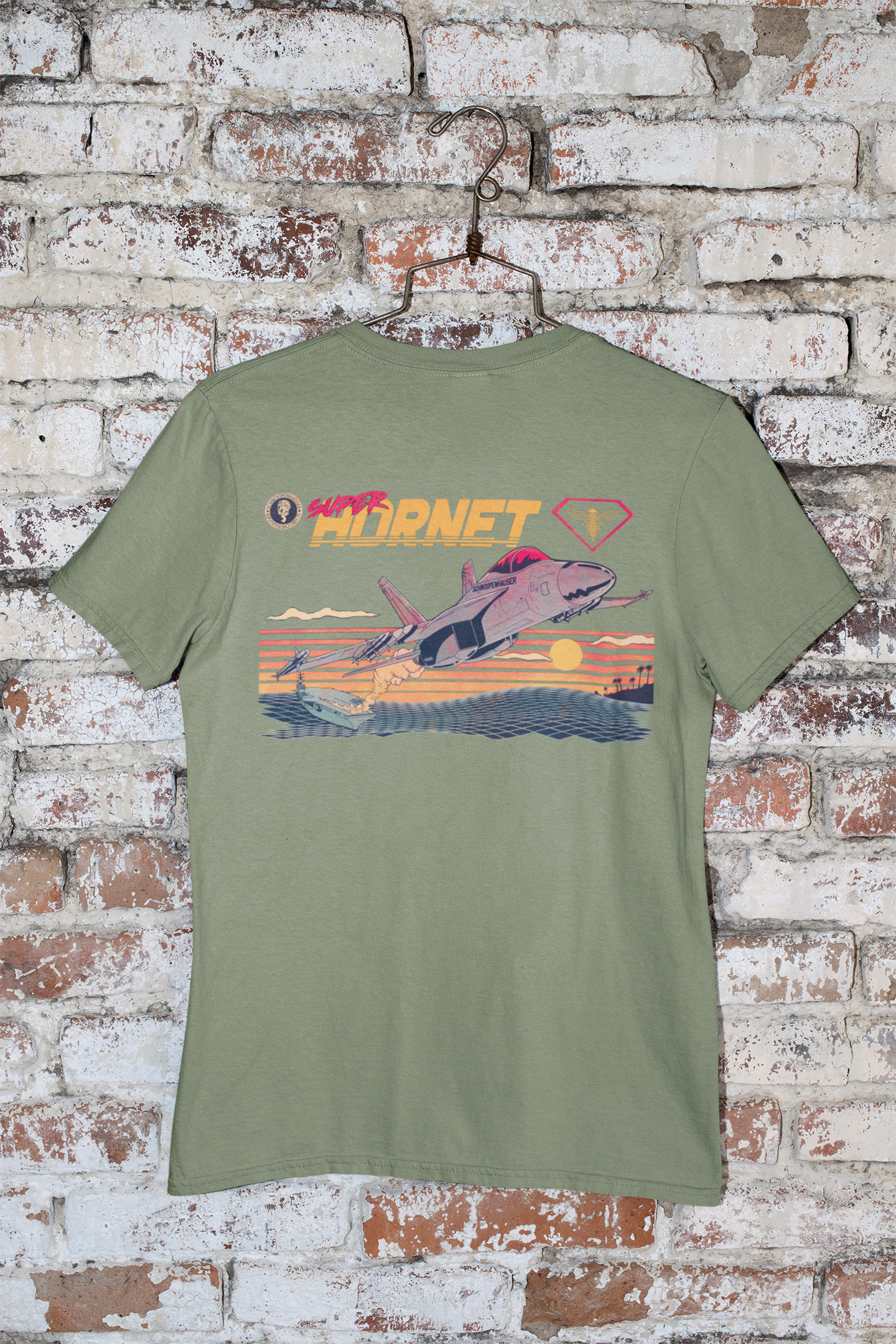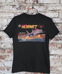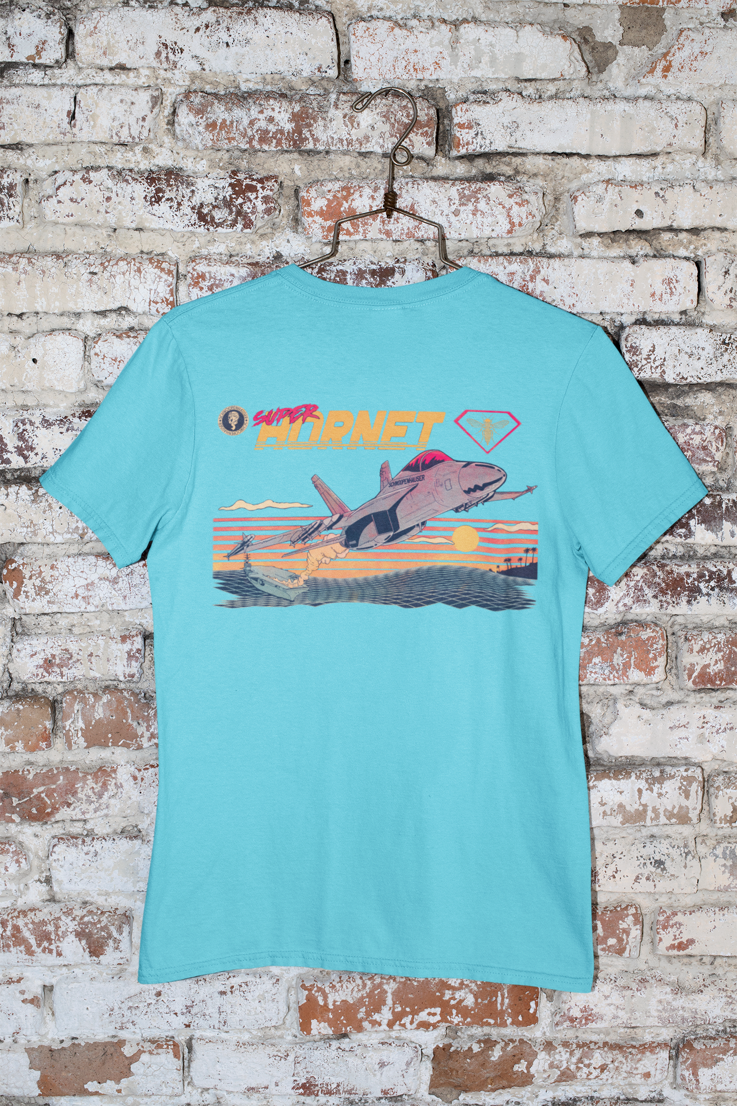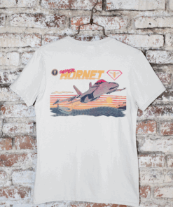 The design features a F/A-18 launching from an aircraft carrier at sunset with and 80’s retro style.