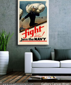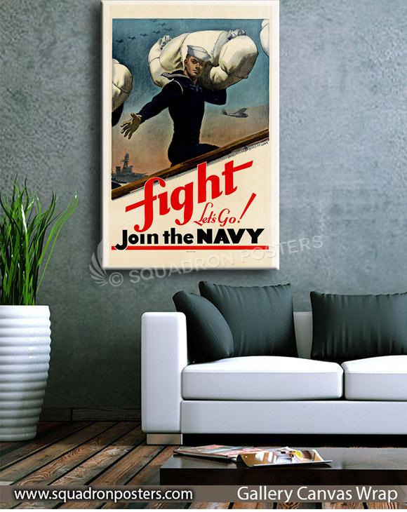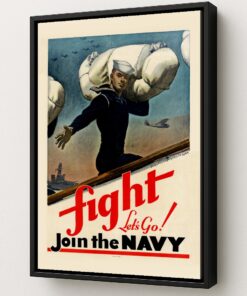 Fight! Let’s Go Join the Navy Historic Art is inspired by classic U.S. Navy recruitment posters that captured the urgency, energy, and fighting spirit of sailors during times of war. The bold call to action reflects the Navy’s readiness to engage, defend, and project power at sea, emphasizing decisive action, teamwork, and national service. Rendered in a vintage poster style, this artwork honors the sailors who answered the call when it mattered most and celebrates the enduring legacy of American naval strength and determination.