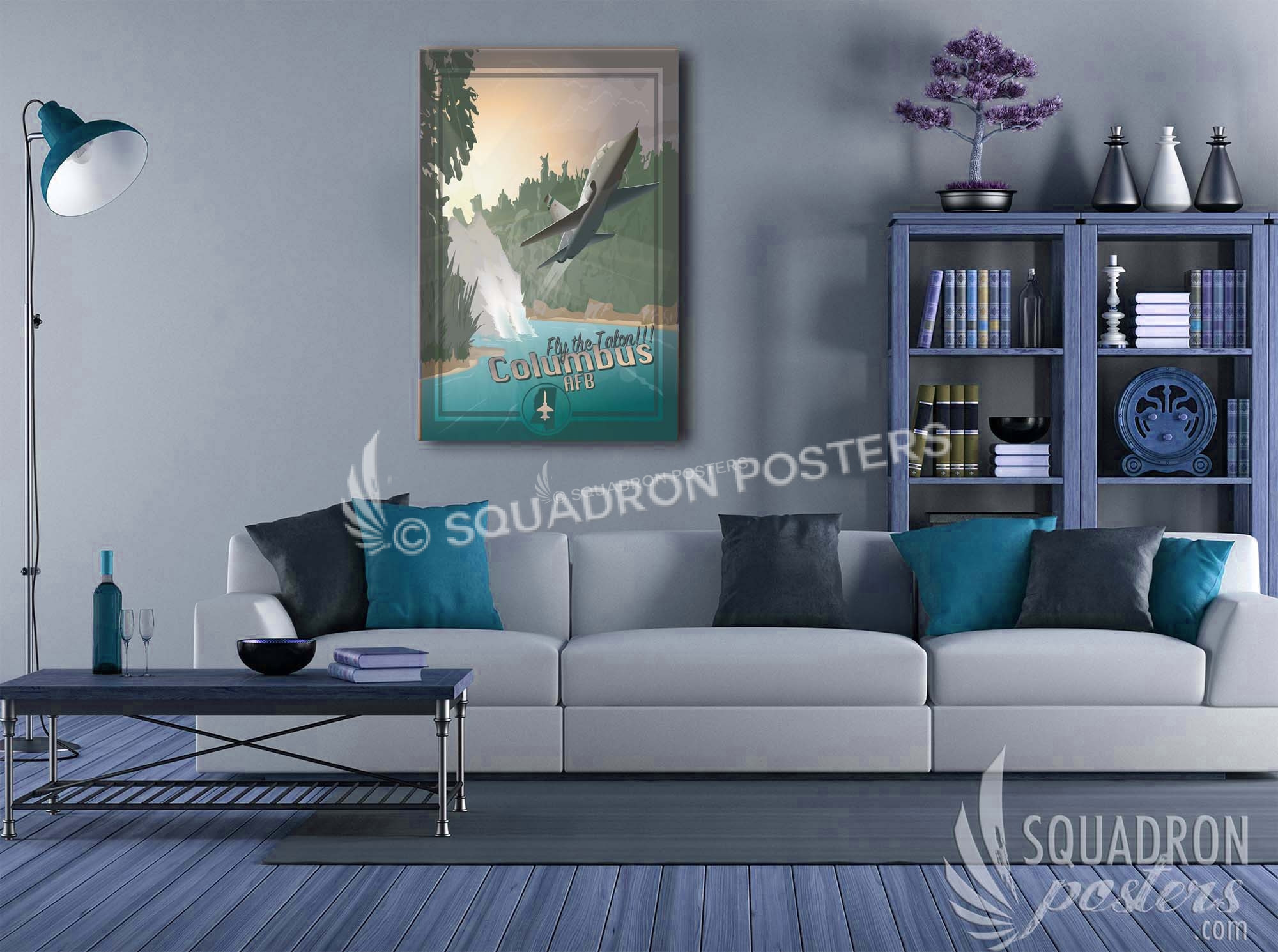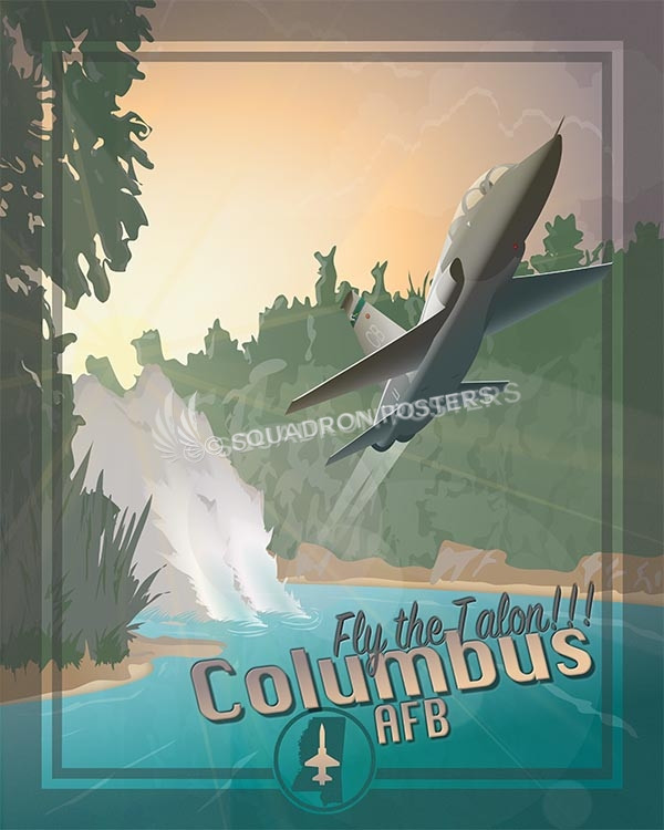 This vintage art deco style military aviation travel poster “Fly the Talon Columbus AFB” is dedicated to all those who trained, flew or supported the T-38 at Columbus AFB.