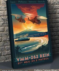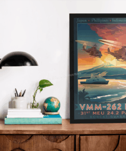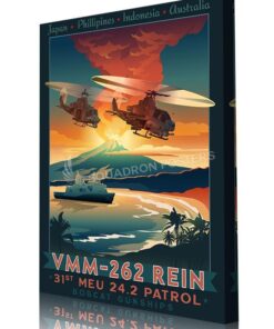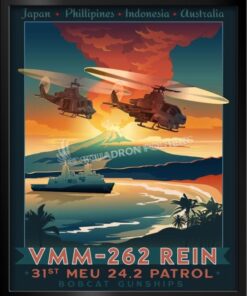 The AH-1Z Viper and UH-1Y Venom are advanced, multi-mission helicopters that play critical roles in the United States Marine Corps. The AH-1Z, also known as the “Viper,” is a twin-engine attack helicopter known for its speed, agility, and precision firepower, capable of engaging a variety of targets with its advanced weaponry. The UH-1Y, nicknamed the “Venom,” is a versatile utility helicopter that excels in troop transport, medevac, and close air support, providing unparalleled flexibility on the battlefield. Both aircraft are designed for durability and effectiveness in the most challenging environments, with cutting-edge avionics and communication systems that enhance mission success. Together, the AH-1Z and UH-1Y form a formidable team, embodying the Marine Corps’ commitment to operational excellence and mission readiness. Check out this stunning Indonesia VMM-262 REIN AH-1 Lead Art by – Squadron Posters! Collect all your military travels and tell your story!