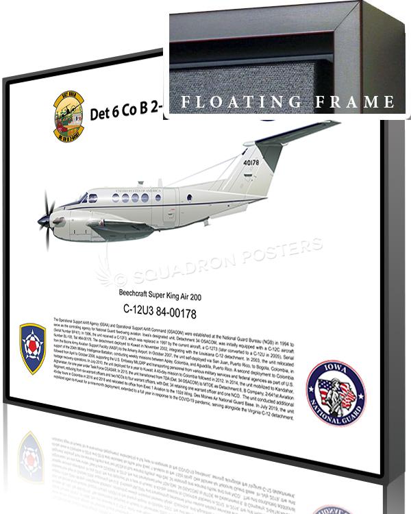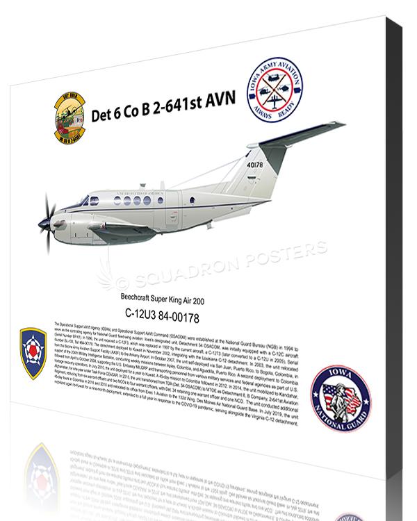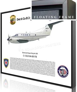 Originally designated U-25A, the first C-12A models entered service with the U.S. Army in 1974 and were used as a liaison and general personnel transport. The aircraft was essentially an “off-the-shelf” Super King Air 200, powered by the type’s standard Pratt & Whitney Canada PT6A-41 engines. Check out this stunning Iowa Air National Guard Det 6 Co B 2-641st AVN Art by Squadron Posters!