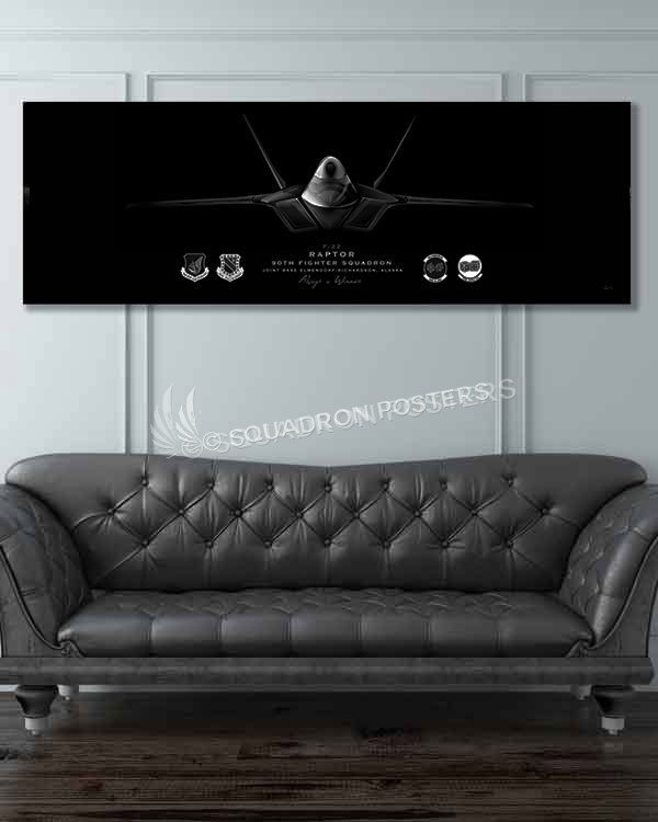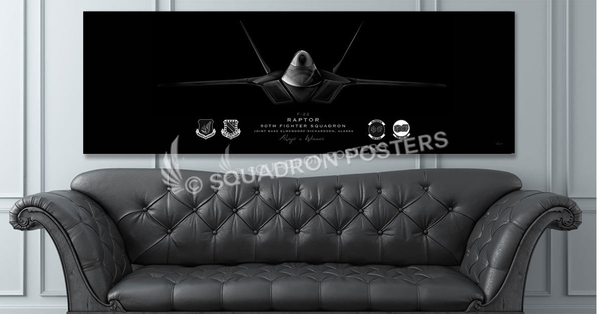 JB Elmendorf-Richardson 90th Fighter Squadron Jet Black Super Wide Canvas Print with Floating Black Gallery Frame. Featuring an F-22 Raptor.