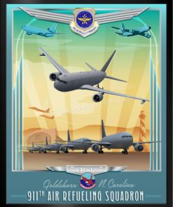 The Boeing KC-46 Pegasus is an American military aerial refueling and strategic military transport aircraft developed by Boeing from its 767 jet airliner. In February 2011, the tanker was selected by the United States Air Force as the winner in the KC-X tanker competition to replace older Boeing KC-135 Stratotankers. The first aircraft was delivered to the USAF in January 2019. The USAF intends to procure 179 tankers by 2027. Check out this stunning JB McGuire-Dix-Lakehurst 911th ARS Art by – Squadron Posters! Collect all your military travels and tell your story!