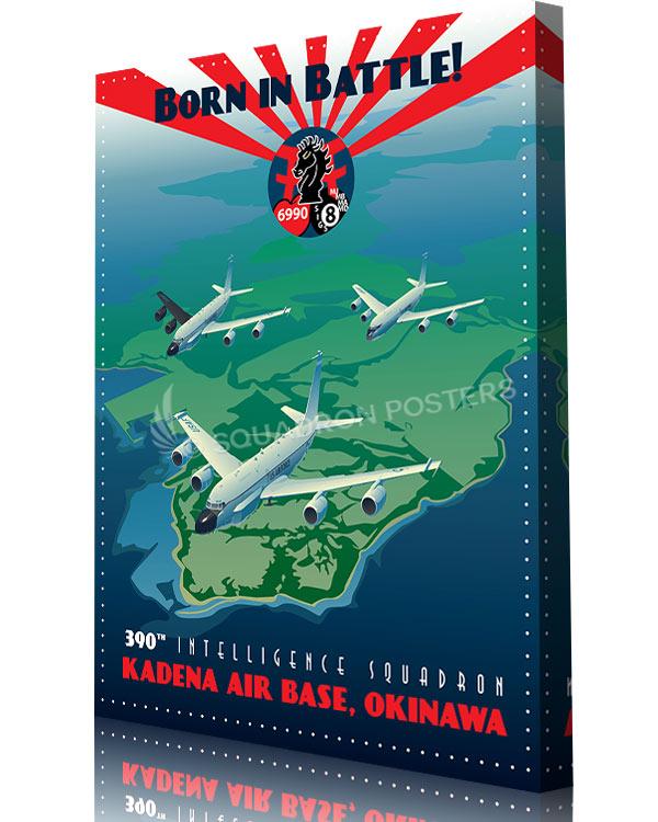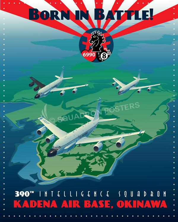 Operating from Kadena Air Base, Okinawa, Japan, the 390th Intelligence Squadron ensures information superiority to the last tactical mile delivering tailored intelligence products to warfighters, combatant commanders, and national decision – makers. This highly specialized unit employs airborne cryptologic linguists, airborne special signals operators, and information integration officers in operational reconnaissance missions. The 390th provides near – real time information awareness to command – and – control assets and direct threat – warning support to tactical aircraft and other warfighters. The 390th Intelligence Squadron supports national – level objectives by providing crews for RC-135U COMBAT SENT and RC-135S COBRA BALL platforms when tasked. BORN IN BATTLE!”