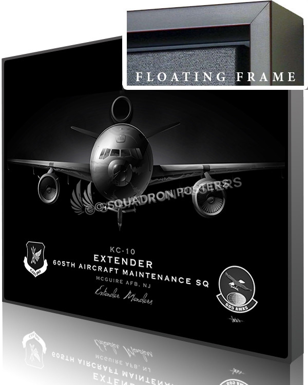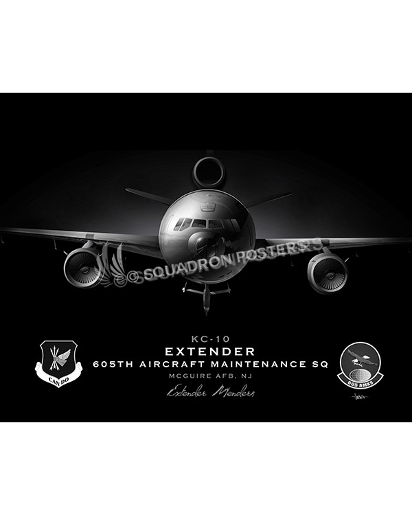 KC-10 605 AMXS Jet Black Lithograph art. The 605th Aircraft Maintenance Squadron (605 AMXS) is part of the 305th Air Mobility Wing (305 AMW) a United States Air Force strategic airlift and air refueling wing under the operational control of the Air Mobility Command (AMC). The 305 AMW is a tenant unit at Joint Base McGuire-Dix-Lakehurst in central New Jersey. The McDonnell Douglas KC-10 Extender is an aerial refueling tanker aircraft– the military version of the three-engined DC-10 airliner operated by the United States Air Force (USAF). The KC-10 was developed from the Advanced Tanker Cargo Aircraft Program. It incorporates military-specific equipment for its primary roles of transport and aerial refueling. It was developed to supplement the KC-135 Stratotanker following experiences in Southeast Asia and the Middle East. The KC-10 was the second McDonnell Douglas transport aircraft to be selected by the Air Force following the C-9. A total of 60 KC-10s were produced for the USAF. The Royal Netherlands Air Force operates two similar tankers designated KDC-10 that were converted from DC-10s.