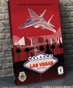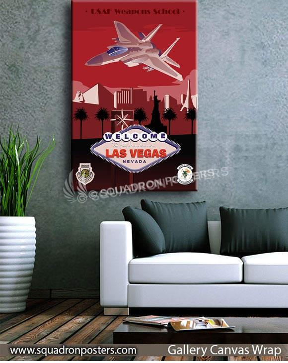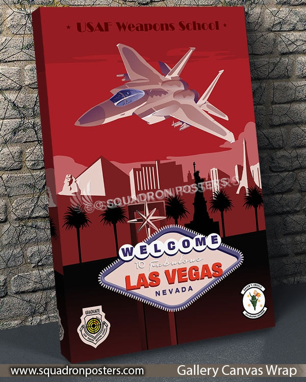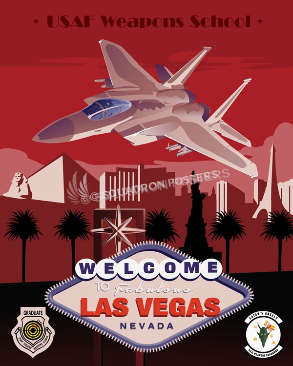 This vintage art deco style military aviation travel poster “Las Vegas F-15 Weapons School” is dedicated to all the hard working men and women at Nellis AFB, Nevada with the 433d Weapons Squadron.
