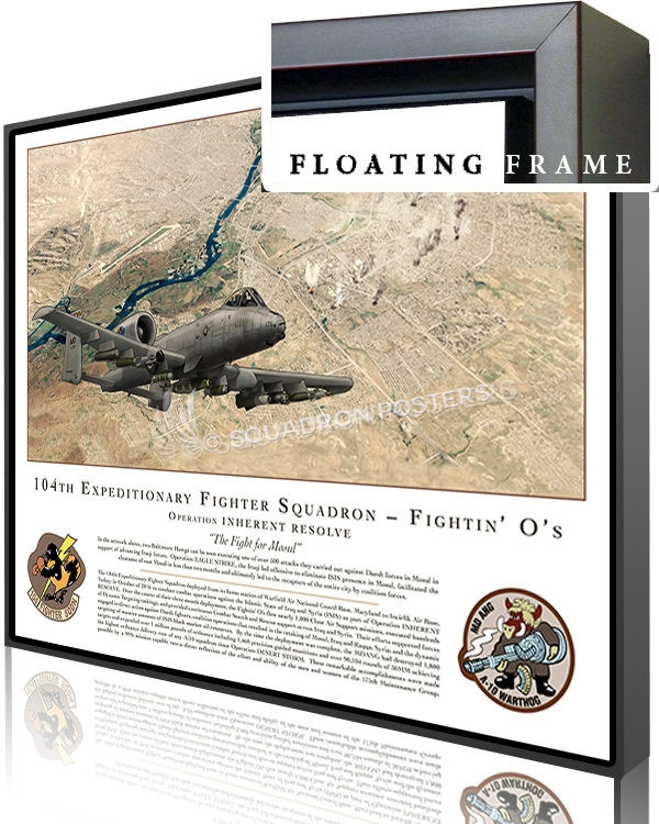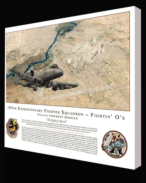 The 104th Fighter Squadron (104th FS) is part of the 175th Wing, Maryland Air National Guard and is based at Warfield Air National Guard Base just outside Baltimore, Maryland. The squadron has flown A-10‘s since September 1979 when they picked up brand new jets off the Fairchild assembly line in Hagerstown, Maryland. The “Fightin’ O’s” have conducted Close Air Support and Combat Search and Rescue missions in the A-10 over Bosnia, Afghanistan, Iraq, and Syria.