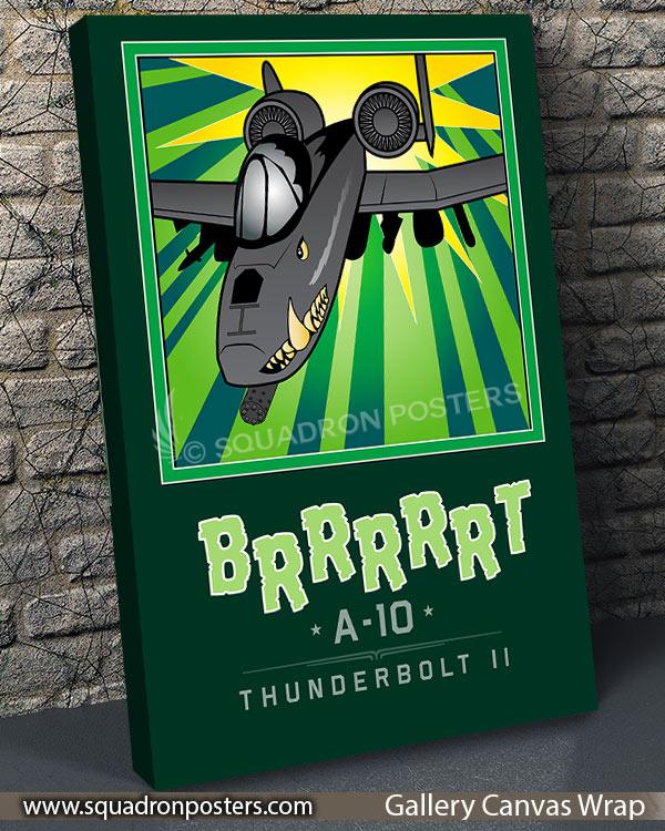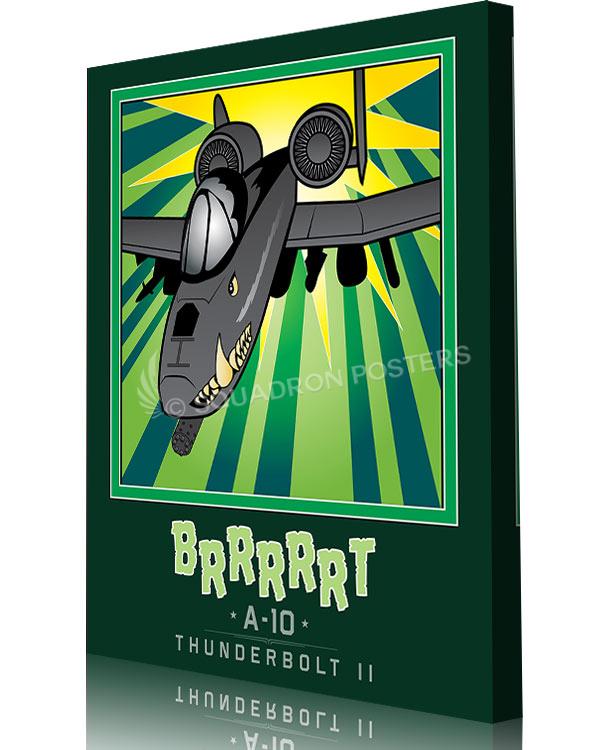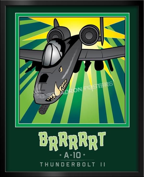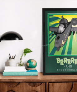 The A-10 was intended to improve on the performance and firepower of the Douglas A-1 Skyraider. The Thunderbolt II’s airframe was designed around the high-power 30 mm GAU-8 Avenger rotary autocannon (producing a distinct “BRRRRRT” sound when fired). The airframe was designed for durability, with measures such as 1,200 pounds (540 kg) of titanium armor to protect the cockpit and aircraft systems, enabling it to absorb damage and continue flying. Its ability to take off and land from relatively short and/or unpaved runways permits operation from airstrips close to the front lines, and its simple design enables maintenance with minimal facilities. Check out this stunning Mission Complete BRRRRRT Book Art by – Squadron Posters! Collect all your military travels and tell your story!