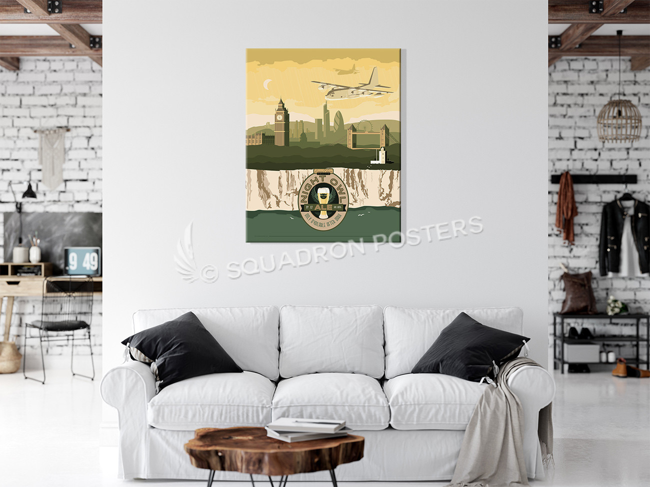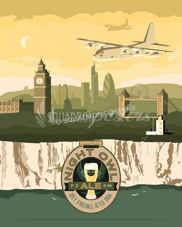 Mildenhall AB C-130 Hercules over London poster art. This Mildenhall C-130 Hercules poster is dedicated to the Special Operators in the 67th Special Operations Squadron – ‘Night Owls‘ or as the poster terms their fictional brewery ‘Night Owl Ale, only available at night’. The background starts off with the famous White Cliffs of Dover and rolls into all the classic downtown London landmarks including a highly detailed Big Ben and London Bridge. World War II ended at 11:00 Paris time which is why Big Ben’s hands read the time it was in London… 10:00. From their base at RAF Mildenhall, the 67th Special Operations Squadron’s MC-130P Combat Shadow flies single or multi-ship low-level air refueling missions for special operations helicopters, and infiltration, exfiltration, and resupply of special operations forces by airdrop or airland.