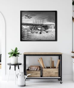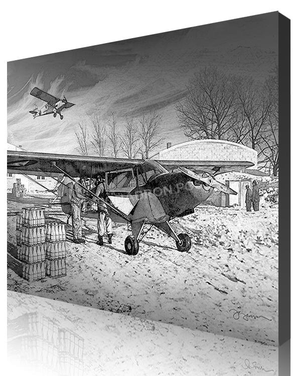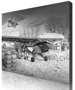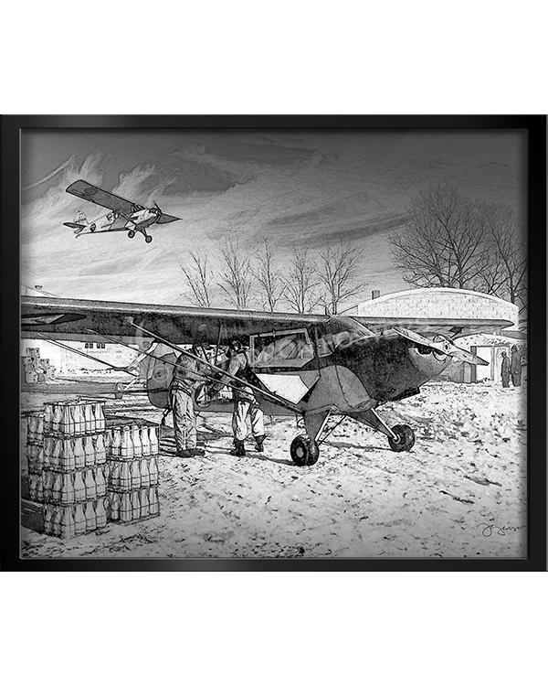 Milk Run–painting for CAP National Historical Journal, Fall 2021. This painting portrays Civil Air Patrol members at Ogallala, Nebraska loading milk into waiting Piper Cub aircraft for delivery to stranded communities. The Great Plains Blizzard of 1949 left a snow-covered swath from Arizona to Wyoming leaving 40-foot-tall drifts that lasted for months.