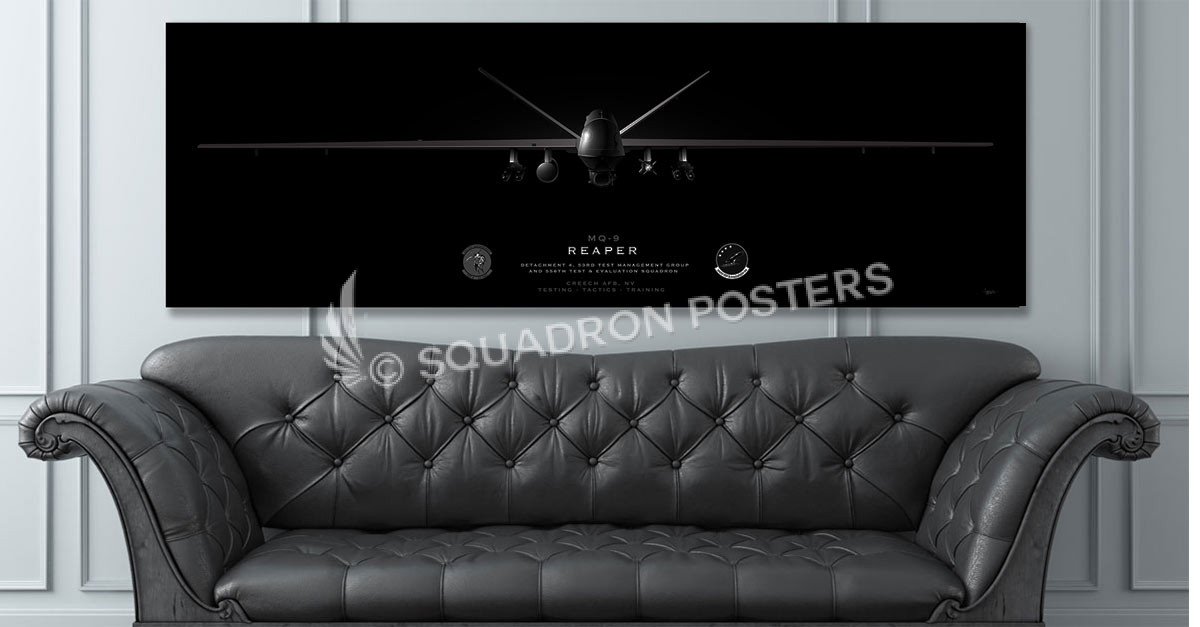 MQ-9 Reaper Jet Black Super Wide Canvas Print with Floating Black Gallery Frame. – The units represented in this artwork are brother/sister organizations.