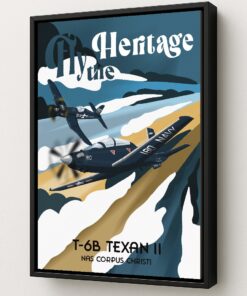 The Beechcraft T-6 Texan II is a single-engined, turboprop aircraft built by Textron Aviation. It is a license-built Pilatus PC-9, a trainer aircraft. The T-6 replaced the United States Air Force’s Cessna T-37B Tweet and the United States Navy’s T-34C Turbo Mentor during the 2010s. The T-6B is used by the US Navy for primary naval aviator training in the Navy, Marine Corps, and Coast Guard. Check out this stunning NAS Corpus Christi T-6B Heritage Art by Squadron Posters!