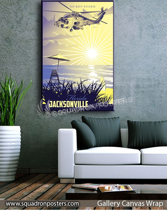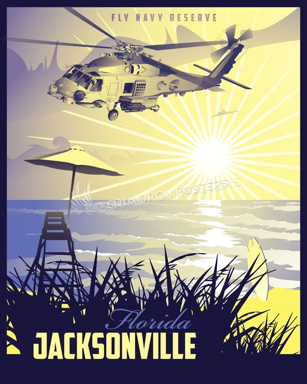This vintage art deco style military aviation travel poster “NAS Jacksonville HSM-60 MH-60R” is dedicated to all the hard working men and women at NAS Jacksonville who serve or have served with the MH-60RNaval Air Station Jacksonville (NAS Jacksonville) is a military airport, eight miles (13 km) south of the central business district of Jacksonville, Florida.  The Sikorsky SH-60/MH-60 Seahawk (or Sea Hawk) is a twin turboshaft engine, multi-mission United States Navy helicopter based on the United States Army UH-60 Black Hawk and a member of the Sikorsky S-70 family. The most significant airframe modification is a hinged tail to reduce its footprint aboard ships. The U.S. Navy uses the H-60 airframe under the model designations SH-60B, SH-60F, HH-60H, MH-60R, and MH-60S. Able to deploy aboard any air-capable frigate, destroyer, cruiser, fast combat support ship, amphibious assault ship, or aircraft carrier, the Seahawk can handle anti-submarine warfare (ASW), anti-surface warfare (ASUW), naval special warfare (NSW) insertion, search and rescue (SAR), combat search and rescue (CSAR), vertical replenishment (VERTREP), and medical evacuation (MEDEVAC). All Navy H-60s carry a rescue hoist for SAR/CSAR missions.