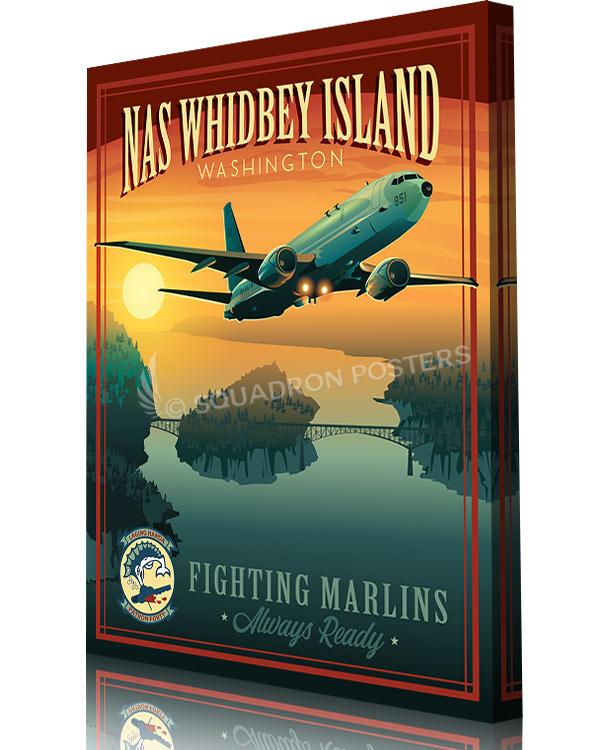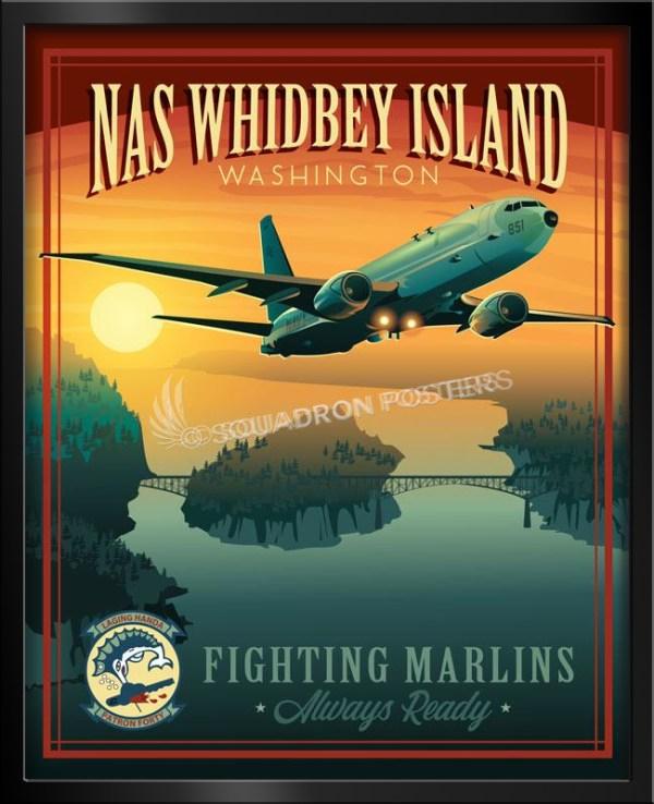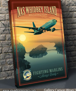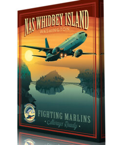 This NAS Whidbey Island VP-40 P-8 vintage style poster art featuring Patrol Squadron 40 (VP-40), also known as the “Fighting Marlins”, is a maritime patrol squadron of the United States Navy based at Naval Air Station Whidbey Island, Washington. VP-40 flies the P-8A Poseidon multi-mission maritime aircraft squadron which conducts anti-submarine and anti-surface warfare, intelligence, surveillance, reconnaissance, and humanitarian response.