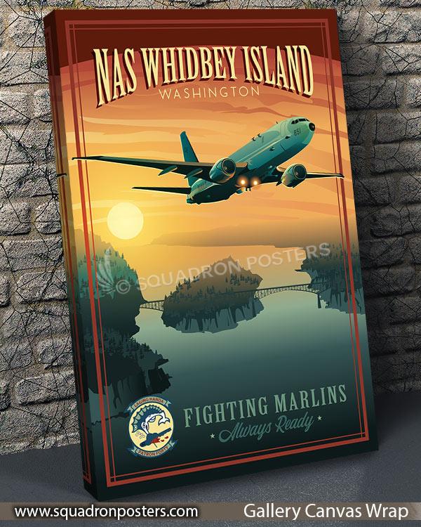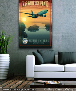 This NAS Whidbey Island VP-40 P-8 vintage style poster art featuring Patrol Squadron 40 (VP-40), also known as the “Fighting Marlins”, is a maritime patrol squadron of the United States Navy based at Naval Air Station Whidbey Island, Washington. VP-40 flies the P-8A Poseidon multi-mission maritime aircraft squadron which conducts anti-submarine and anti-surface warfare, intelligence, surveillance, reconnaissance, and humanitarian response.