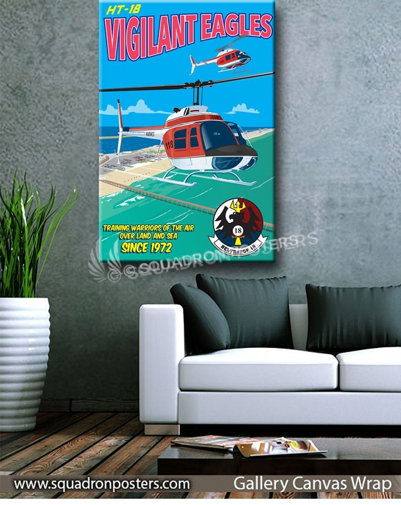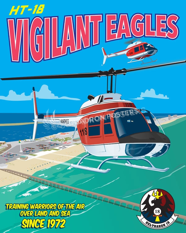 This vintage art style military aviation travel poster “NAS Whiting Field HT-18” is dedicated to all the hard working men and women who serve or have served with Helicopter Training Squadron 18 at NAS Whiting Field. Helicopter Training Squadron EIGHTEEN (HT-18), established in 1972, continues its in-depth training of student aviators graduating professional naval officers and aviators who are “Fleet Ready,” able to meet today’s real world missions for the United States Navy, Marine Corps, and Coast Guard. The squadron also provides rotary-wing training and designation to selected members of various allied nations, refresher and transition training to fleet aviators, and indoctrination flights for mid-shipmen, and flight surgeons. HT-18‘s primary mission is to transition student aviators through basic and advanced rotary wing pilot training. Basic training introduces and develops student skills in helicopter flight maneuvers as well as training in visual navigation and tactics. Advanced training completes an intensive curriculum of basic and radio instruments, advanced tactics, and shipboard landings. The completion of this exacting training syllabus culminates in a highly trained and proficient all weather aviator.
