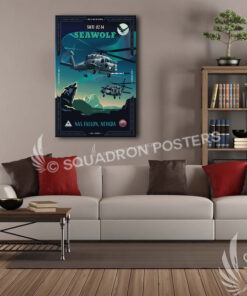 The Navy Rotary Wing Weapons School (N8) instructs graduate-level rotary wing employment through the “SEAWOLF” Seahawk Weapons and Tactics Instructor(SWTI) course. It also conducts the Strike Leader Attack Training Syllabus (SLATS), Senior Officers Course (SOC), assists N5 with airwing training, and manages the Navy’s Mountain Flying Course. This artwork depicts SWTI “class 02-14“.
