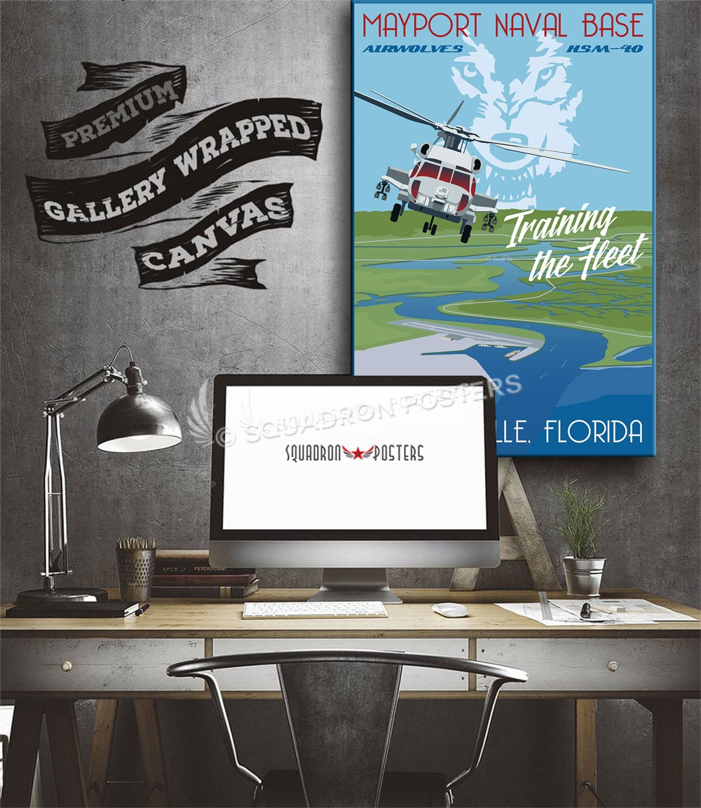 This vintage art deco style military aviation travel poster “Naval Station Mayport HSM-40 MH-60R” is dedicated to all the hard working men and women at Naval Station Mayport who serve or have served with HSM-40 “Airwolves” and the MH-60R. Helicopter Maritime Strike Squadron FOUR ZERO (HSM 40) is located in Hangar 1552, Naval Station Mayport, Jacksonville, Florida. The squadron was established 4 October 1985 to serve Helicopter Maritime Strike Wing Atlantic. Their mission is to provide quality training to Fleet Replacement Pilots and Aircrew so they can fight and win at sea.