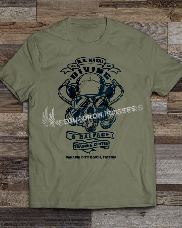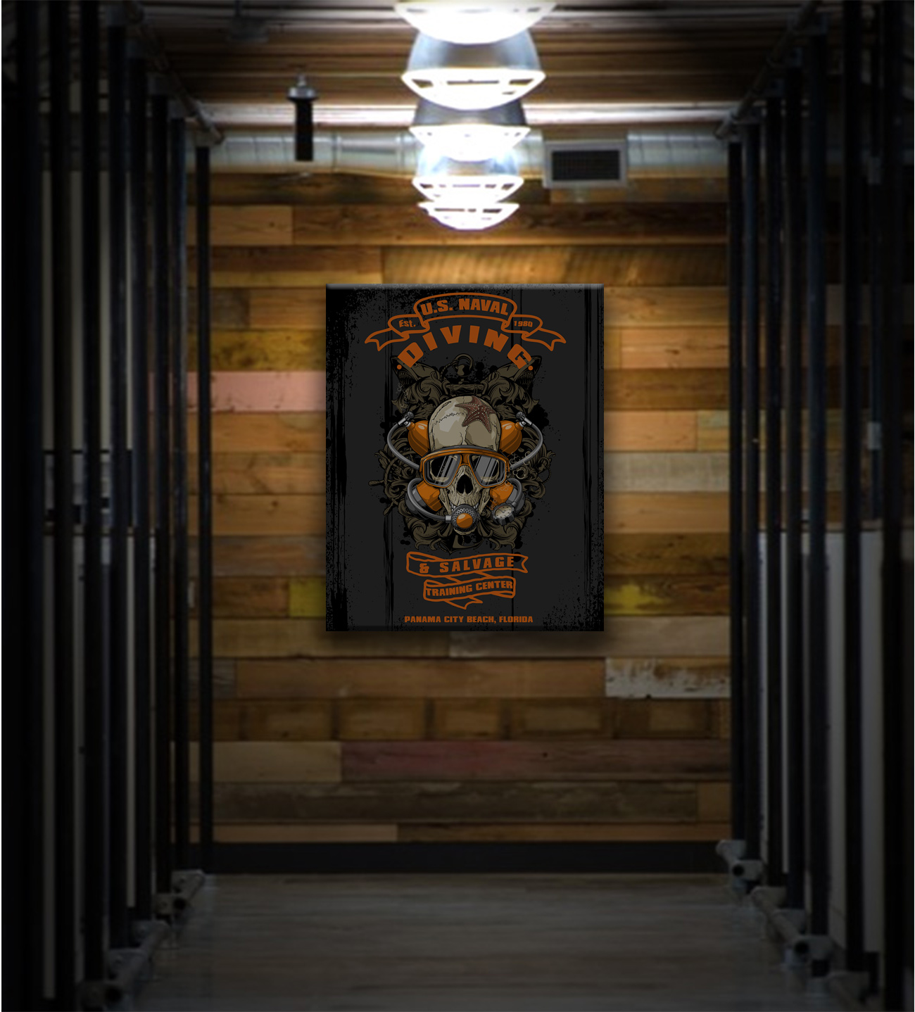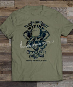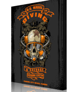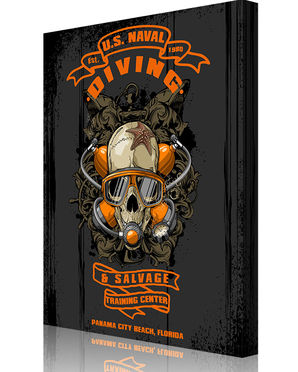 This vintage art deco style military travel poster “U.S Naval Diving and Salvage Training Center” is dedicated to all those who trained at The Naval Diving and Salvage Training Center (NDSTC)The Naval Diving and Salvage Training Center (NDSTC) is the largest diving facility in the world. Located in Panama City on the Florida Panhandle, NDSTC trains military divers from all services. More than 1200 students train each year in the 23 courses offered at NDSTC. Students include candidates for submarine SCUBA, U.S. Navy Deep Sea Divers, Seabee Underwater Construction Divers, Joint Service Diving Officers, Explosive Ordnance Disposal (EOD) Officers, Diving Medical Technicians, Diving Medical Officers, U.S. Army Engineer Divers, U.S. Marine Corps Combatant Divers, U.S. Coast Guard Divers, and U.S. Air Force Pararescue Operators and Combat Controllers. A limited number of U.S. law enforcement, U.S. government agency and students from allied and coalition nations also train at NDSTC.
